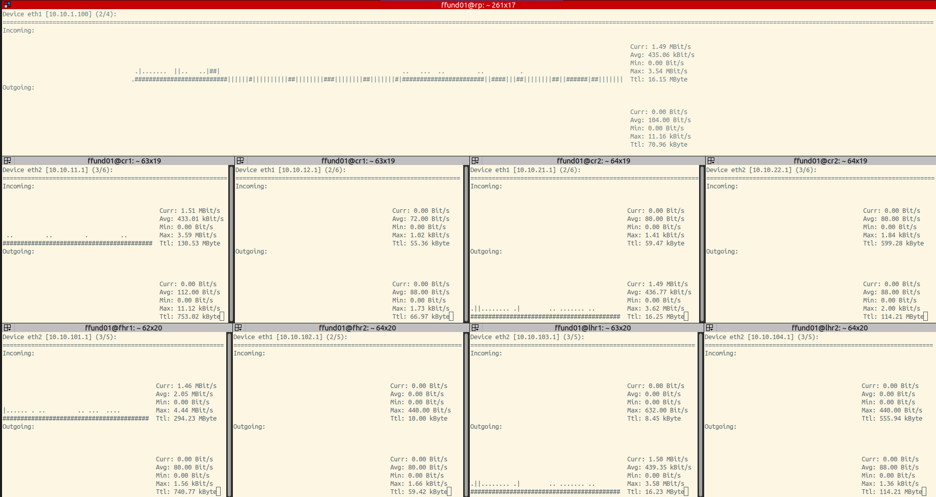 vlc --intf ncurses --vout dummy --aout dummy udp://@239.255.12.42 --repeatWait about a minute, then take a screenshot of the nload terminal panels, showing the network load on each segment. (Make sure that the Curr part of the nload display, which shows the current network load, is visible for each interface. If you have the nload sessions split across multiple windows, you'll take a screenshot of each.)